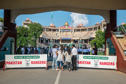 Nel tardo pomeriggio assisto a un evento che inseguo da tempo, la surreale cerimonia di ammainabandiera che si svolge ogni sera, poco prima del tramonto, a Wagah, al confine tra India e Pakistan, due paesi perennemente in guerra, a volte apertamente dichiarata, altre volte in modo più strisciante, da quando nel 1947 nacquero come stati indipendenti dalla ripartizione dell’Impero Britannico Indiano. Wagah si trova sulla Gran Trunk Road, l’antichissima strada che da due millenni unisce le aree orientali a quelle occidentali del vasto subcontinente indiano. È stata per decenni l’unica via ufficialmente aperta tra i due paesi, fino a quando nel 1999 non ne è stata aperta un’altra in Kashmir, il territorio conteso tra le due nazioni che è da sempre il motivo principale delle loro dispute armate. Ogni sera l’ammainabandiera è preceduto da una specie di show messo in scena dai soldati delle due opposte fazioni: i Rangers del Pakistan e le Forze di Sicurezza di Confine dell’India. I soldati, dotati di vistosi copricapi che ne enfatizzano le movenze, si sfidano con gesti che trasudano tracotanza e spavalderia, con passi estremamente pronunciati, veloci scatti della testa e mostrando i muscoli al nemico. Alla scena assiste ogni volta una platea di diverse centinaia di spettatori (incitati da capi claque) e turisti, che assistono con la stessa partecipazione che ci si aspetterebbe per una partita della propria Nazionale di calcio, facendo un tifo sfegatato e reagendo ai gesti più provocatori. In teoria il tutto dovrebbe rappresentare l’amicizia e lo spirito di collaborazione fra i due paesi – la cerimonia si conclude con una brusca stretta di mano fra due soldati delle diverse forze e con le bandiere ammainate perfettamente all’unisono – ma nel tempo è aumentata la componente di sfida che inequivocabilmente anima questa strana cerimonia. In passato l'esibito senso di provocazione insito in questa cerimonia è stato ufficialmente criticato dal generale dei Pakistan Rangers che auspicava una riduzione della teatralità delle movenze. Ciò nonostante, il 2 novembre 2014, un teenager si è fatto esplodere sul lato pakistano mentre indossava 5 kg di esplosivo, causando la morte di 60 persone e il ferimento di oltre 100. A “giocare alla guerra” poi finisce che qualcuno non capisce che non è un gioco. L'evento a cui assisto io è per fortuna molto tranquillo, la gente (anche se direi un po' più numerosa sul lato indiano) sorride e sventola bandierine, forse anche per trovare un minimo di refrigerio ai circa 38° di un afosissimo lunedì estivo, mentre intona all'unisono "Allah akhbar"!, una frase che non mi sarei mai aspettato di sentire in un'atmosfera da festa di paese.​​