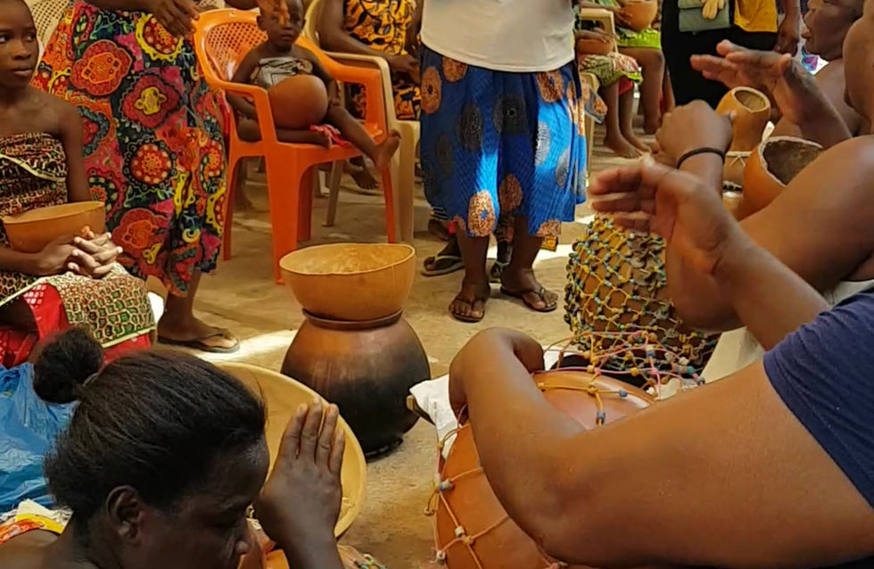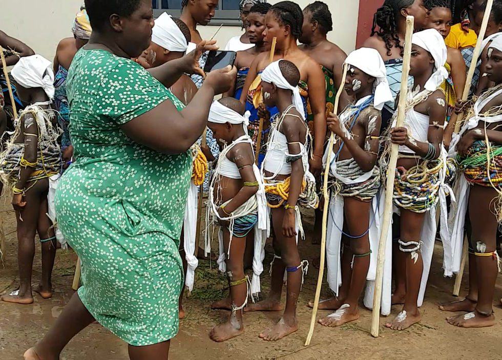 Dopo un po' le iniziande, tutte coi capelli rasati cortissimi, vengono messe in fila indiana, vestite con una stoffa colorata, i piedi scalzi, una specie di collana di fibra al collo e delle tracce di una sostanza bianca (che dicono essere mirra) su fronte, guance e spalle. Con in testa una calebasse - che tutte tengono con due mani - all'interno delle quali si notano una stoffa rossa e delle fibre vegetali, escono dal cortile del palazzo e, guidate dalle donne più anziane, attraversano le strade della città per recarsi al fiume. Questa storia della "parata" tra le strade si ripeterà, perché uno degli scopi originari di questo rito è di far sapere che le ragazze sono pronte per sposarsi. Arrivati a un certo punto, ormai nei pressi del fiume, mi viene detto di non proseguire oltre, perché al fiume le ragazze evidentemente si spogliano per "purificarsi".