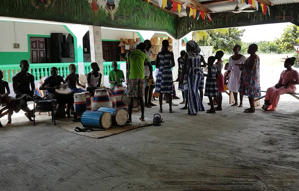 In seguito, visto che al Dipo Palace ci consentono di andare solo nel pomeriggio (secondo quanto mi risulta, stamattina dovrebbe esserci il rituale durante il quale alle ragazze vengono lavati i piedi col sangue di una capra offerta in sacrificio dalla famiglia e, siccome le cerimonie del Dipo sono contestate da alcuni attivisti - per via del fatto che le ragazze devono sfilare per la città mezze nude - probabilmente non vogliono fare assistere agli stranieri a questa parte del rituale che solleva altrettante critiche), ci rechiamo dal prete voodoo. Lui non c'è, è in viaggio non si sa dove, però ci sono dei ragazzi e qualche adulto che suonano le percussioni e danzano. Non sembrano essere venuti apposta, sembra che vivano lì, ogni tanto qualcuno spunta da una porta e si aggiunge al gruppo. Non saprò mai se avrei potuto assistere a una cerimonia voodoo vera e propria o se l'accordo preso prevedeva di vedere queste danze (belle sì, ma niente di particolarmente nuovo).