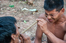 La reazione fu immediata. Il volto di Dennis diventava una smorfia di dolore ad ogni soffiata. Si dice che sia come un'esplosione: naso e occhi bruciano, si annebbia la vista e il polso batte all'impazzata. Poi, veloce come è arrivato, il dolore sparisce e si entra in una fase di stanchezza e ci siede o sdraia. Durante questo momento si va come in trance: si sognano gli animali, dove trovarli e come cacciarli e si spiega loro che li si caccia per motivi di sostentamento. Poi basterà andare nei luoghi sognati e cacciare gli animali apparsi in visione. Secondo i Matsés anche le prede hanno le stesse visioni, quindi sanno cosa li aspetta e non si spaventano. Sembra una procedura per chiedere il permesso alle prede di poterle catturare, e vivere pertanto in armonia con la Natura. Di questa procedura non bisogna abusare perché la Natura, che ha voluto condividere i suoi segreti con i Matsés facendogli conoscere il nu-nu, non vuole che gli uomini siano troppo avvantaggiati rispetto agli animali. Come quando, nel periodo delle alluvioni, si piazzano trappole per i tapiri. Si può catturarne massimo tre, non di più, e se dopo averne catturati tre ci sono altre trappole ancora in funzione, bisogna mandare qualcuno a disattivarle, perché se ne venissero uccisi degli altri, gli spiriti della foresta si arrabbierebbero e direbbero ai tapiri di non andare più in quella zona della foresta. Il nu-nu, come anche il rito del sapo, vengono utilizzati anche solo per "vedere nel futuro o a distanza": lo si assume per sapere e quando una trappola, anche se posizionata a decine di chilometri di distanza, ha fatto il suo dovere. Questa sostanza può essere assunta anche per motivi diversi dalla caccia, come ad esempio per recupera da un periodo di stanchezza oppure per stimolare visioni. La vera differenza rispetto alla cerimonia del sapo sta nel fatto che nel soffiare il nu-nu è come se venisse trasmessa, assieme all'aria dei polmoni, anche parte della conoscenza, della forza e della saggezza di chi soffia. per questo a soffiare è sempr eun adulto espserto verso un giovane e non viceversa, sempre tra uomini.